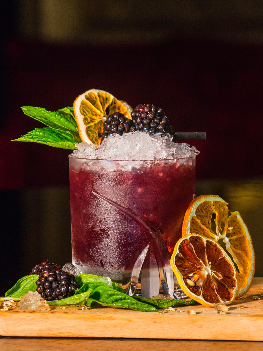 Put all the ingredients into a bar cylinder and shake with ice. Strain into a pre-cooled glass. Decorate with oranges and mint leaves.